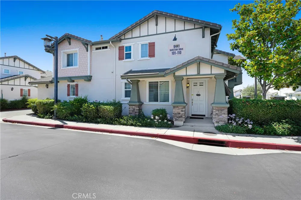 Welcome to 9441 Barstow Dr #101, a beautifully maintained condo situated within the highly sought-after Main Street community in Rancho Cucamonga. This residence boasts an exceptional location, providing easy access to the best attractions that this city has to offer. You'll undoubtedly cherish the enviable position of this special home. Step inside to discover a thoughtfully designed floorplan that caters to those who value an open concept, abundant space, and natural light. As you enter, you'll be greeted by a welcoming living room adorned with a gas fireplace, a sunlit dining area, and a warm, well-appointed kitchen. The remodeled kitchen is truly the heart of the home, featuring maple cabinets that offer ample storage, granite countertops, and a convenient breakfast bar for casual dining. Hosting gatherings is effortless, as the downstairs living spaces are complemented by an adjacent powder room and a charming front secure courtyard. Moreover, the connected and oversized two-car garage ensures convenient daily living. The private quarters are located upstairs, comprising two spacious bedrooms. The primary suite includes an en-suite bathroom with a walk-in closet, double vanity, a separate chamber room, and a soothing soaking tub/shower combination. Additionally, there's a secondary bedroom with an adjacent full bath, an open den that can be used as a versatile space, and a laundry room with a linen storage closet. This delightful community not only offers a sense of intimacy and warmth but also provides various amenities for residents to enjoy. Experience the convenience of a playground, a dog park, a pool and spa complex, a barbeque pavilion, and meticulously maintained landscaping, all within a friendly and welcoming environment. With all these wonderful features, this move-in ready home is primed and waiting for you to make it your own. Embrace the opportunity to live in a prime location and experience the true essence of Main Street @ Route 66 living at its finest.