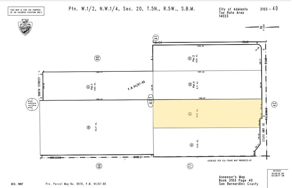 ±9.6 acres of land on Palmdale Rd in Adelanto; APN: 3103-401-07. Dual zoning creates an approximate estimate of ± 4.6 acres of Commercial ( C ) land with 334 ft of frontage on Palmdale Rd and ± 5 acres of Singe Family Residential (R-S5) allowing for up to 5 dwelling units per acre. Water at site with sewer nearby. More than 5,000 developed rooftops in the immediate area, with many more under construction. This property is also located within Adelanto’s Opportunity Zone, for potential tax deferment. Local amenities include Stater Bros Market, Starbucks, Walmart Supercenter, AutoZone, CVS Drug Store, El Pollo Loco, Panda Express, and more.
